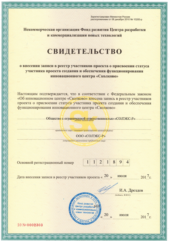 Обе компании ООО "СОЛЭКС-С" и ООО "СОЛЭКС-Р" имеют статус участника проекта создания и обеспечения функционирования инновационного центра Сколково.